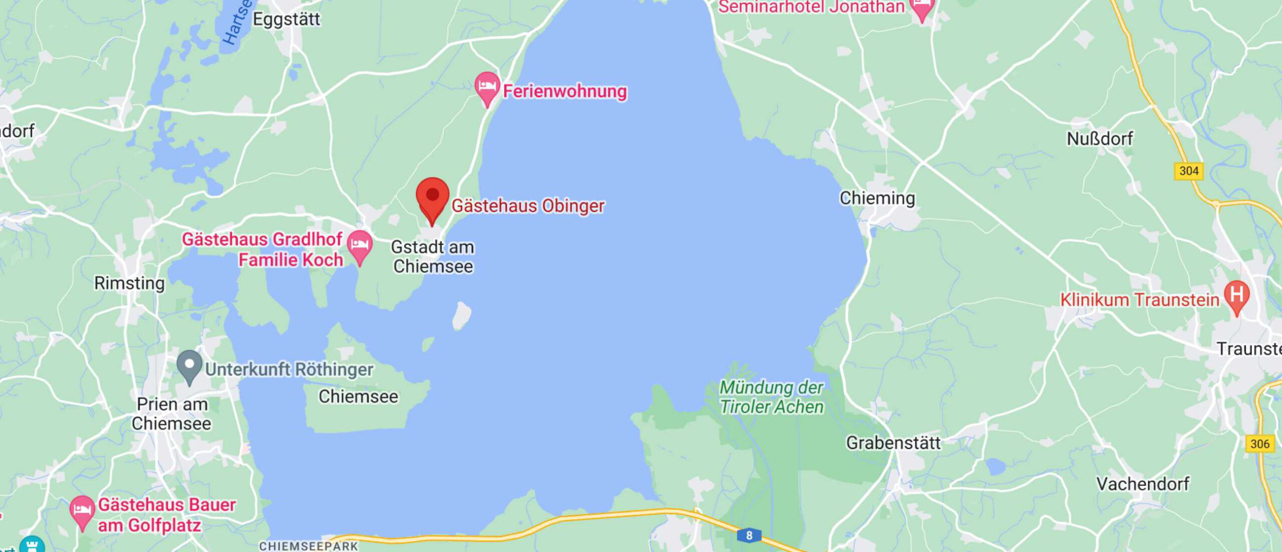 Folgen Sie der Straße nach Prien. Ab Prien folgen Sie der Beschilderung Rimsting – Breitbrunn bis Gstadt.